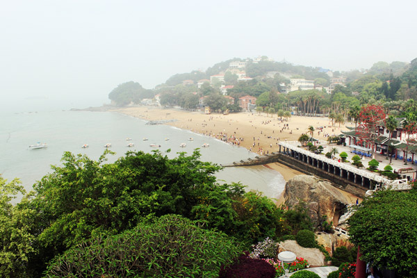 在鼓浪嶼上和大海的親密接觸是必不可少的,金黃色的沙灘,蔚藍(lán)的海水一望無際。五月的天氣正值鼓浪嶼旅游的旺季,所以沙灘上的人也特別多,大家紛紛脫掉鞋襪,奔向大海,踏著浪花,吹著海風(fēng),頂著明媚的陽光,盡情的嬉戲,每個(gè)人臉上都綻放著燦爛的笑容,笑聲和浪聲譜寫成一曲美妙的交響樂。